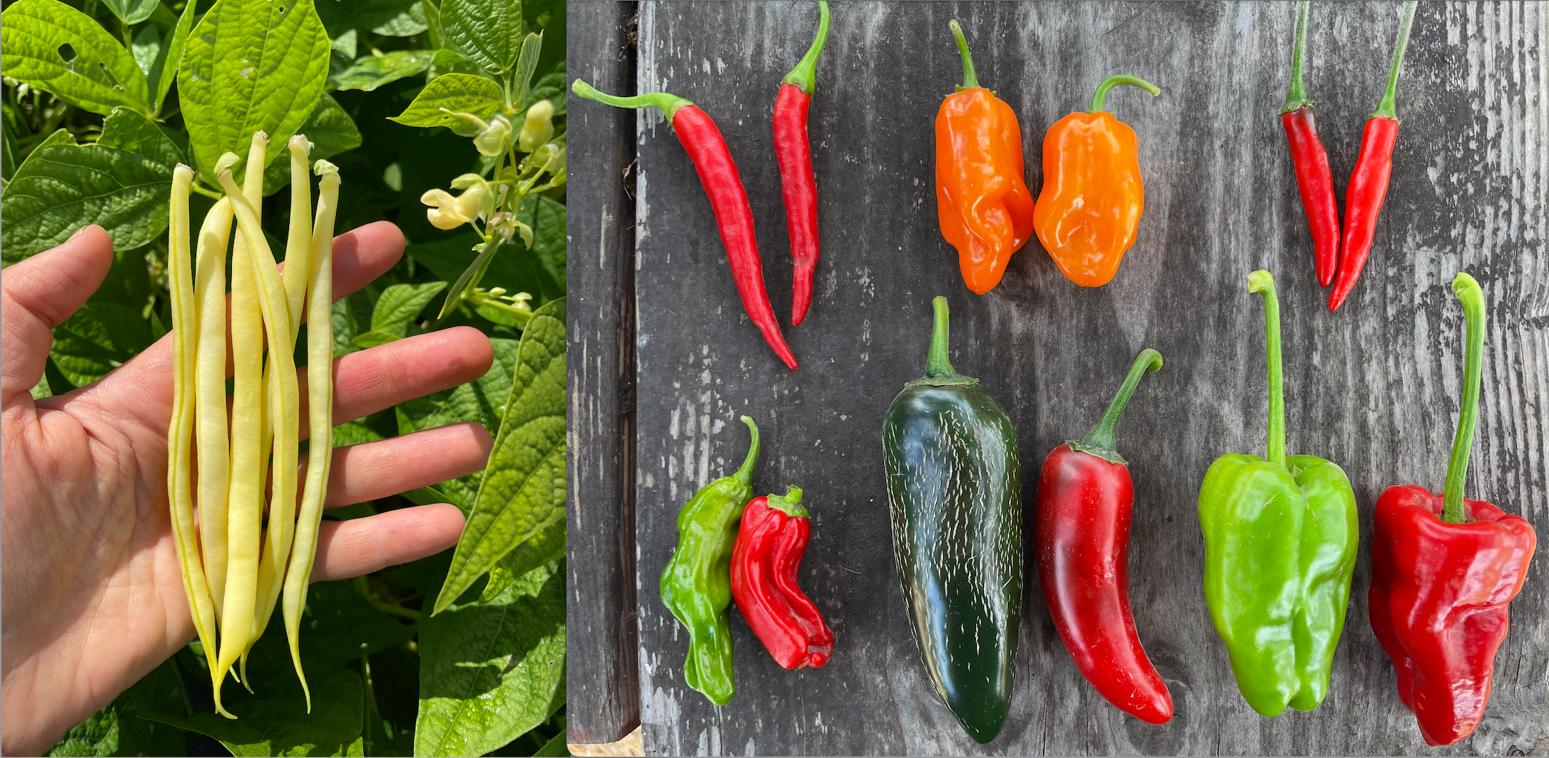 Goldilocks Beans & this year’s Hot Peppers: Top row, left to right: Thai Chilis, Habanero, Vietnamese Devil Pepper / Bottom row: Shishitos, Jalapenos, Padrons.