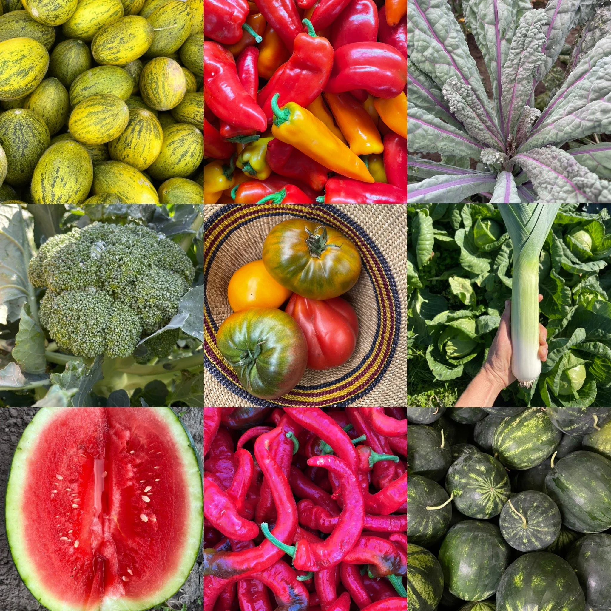 Harvest Moon Potatoes, Green Magic Broccoli, Sweet Peppers, Tomatoes, Carrots, Assorted Zucchini, Patty Pan & Crookneck Squash, Slicing Cucumbers, Cracker Jack Watermelon, Piel de Sapo Melons, Farao Cabbage, Leeks, Dazzling Blue Dino Kale, Assorted Little Gem Lettuces, Romaine Lettuce, Arugula