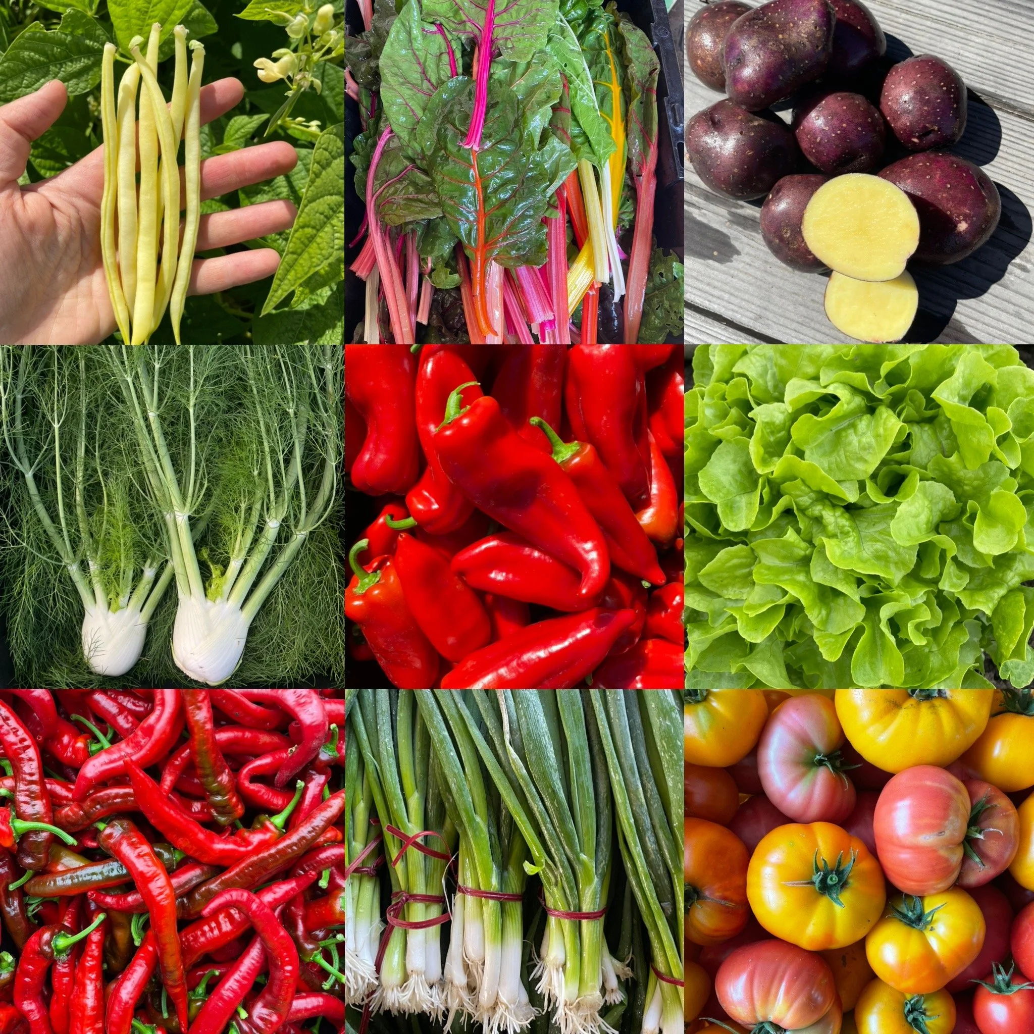 Garlic, Harvest Moon Potatoes, Bulk Sweet Peppers, Tomatoes, Rainbow Carrots, Daikon Radish, Leeks, Scallions, Fennel, Rainbow Chard, Mei Qing Bok Choi, Assorted Lettuces, Spinach, Arugula, Mustard Mix