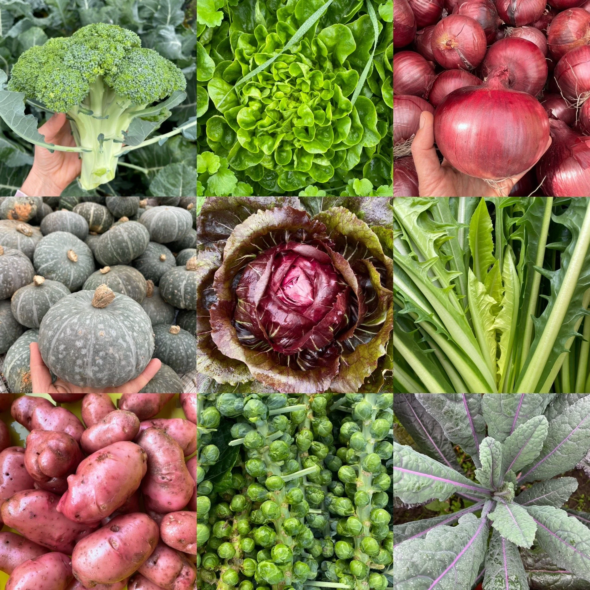 Jelly and Harvest Moon Potatoes, Winter Luxury Pie Pumpkin or Sunshine Kabocha Squash, Butternut Squash, Celery Root, Yellow and Red Onions, Garlic, Carrots, Beets, Watermelon Radishes, Brussel Sprouts, Black Magic Dino Kale, Radicchio, and Assorted Lettuce.