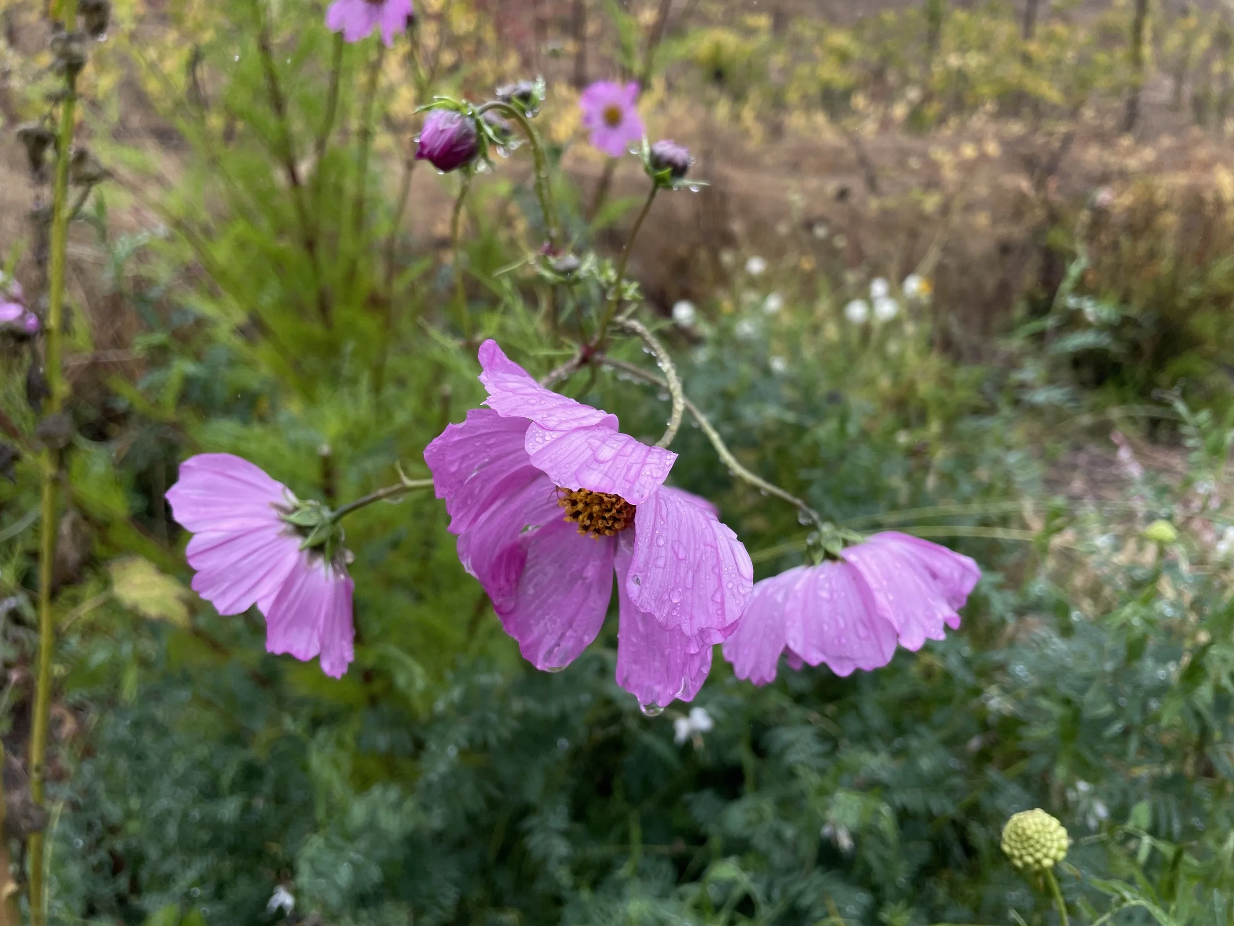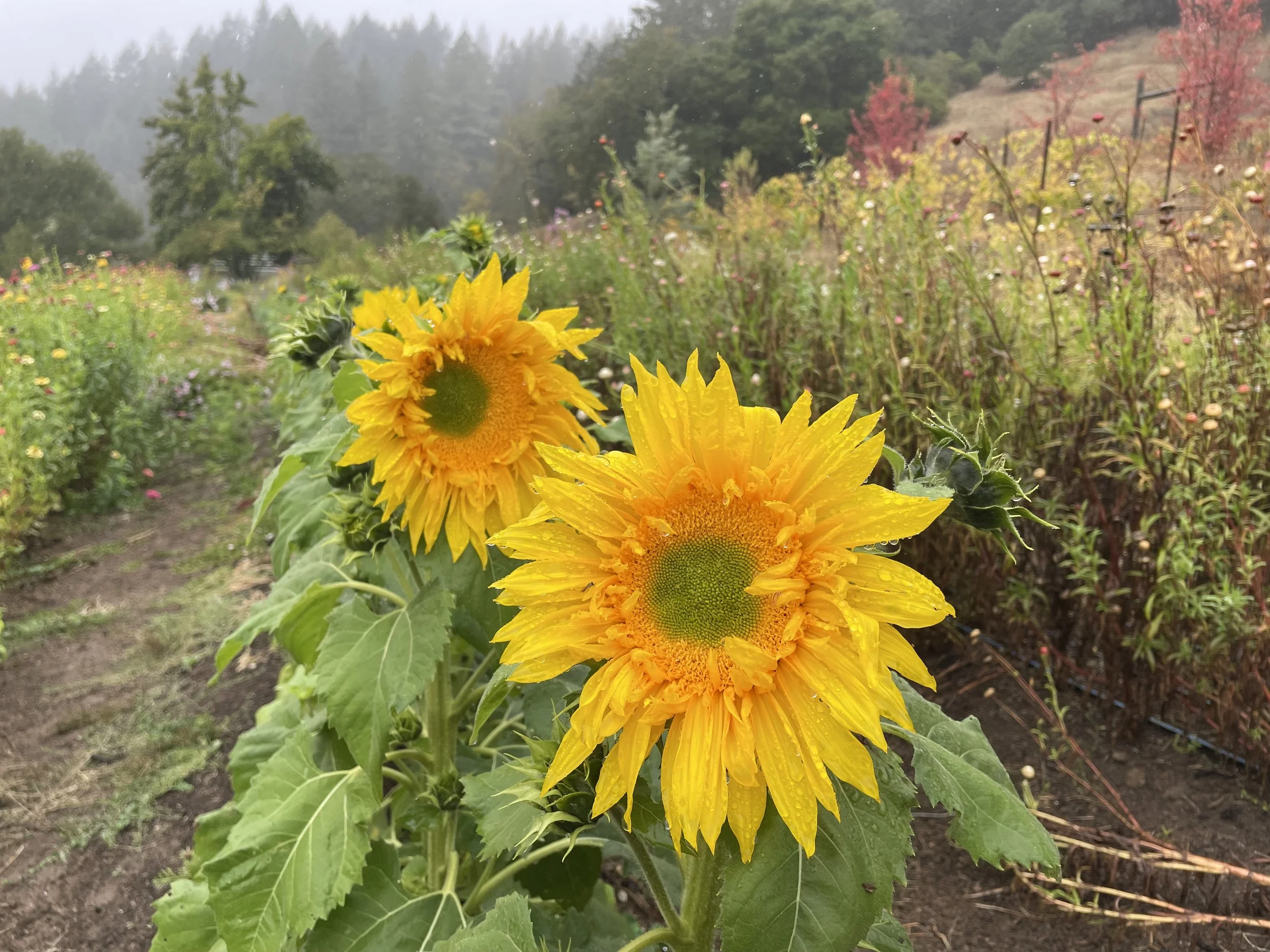 Flower Update: Many of you are probably wondering with the rain (!!!), the cold and the wind we’ve been experiencing, if there are still any flowers to be had in the garden. And while the rain Sunday will likely knock some of the taller plants over, the answer is yes! Our south-facing slope stays frost free quite late and there are still tender flowers and herbs in profusion. There’s a last, very late succession of giant green-centered sunflowers blooming on the far side below the strawflowers and in some moments the garden actually looks more beautiful in the rain, with the gem-like colors covered in raindrops.